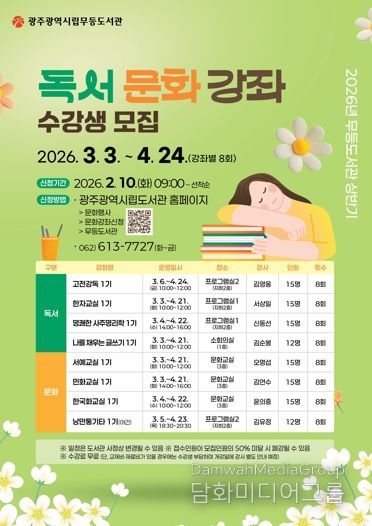 시민행정신문 강갑수 기자 | 광주광역시 시립도서관(무등,사직,산수,하남)은 3월부터 5월까지 운영하는 상반기 독서·문화교실 수강생을 오는 10일부터 선착순 모집한다.