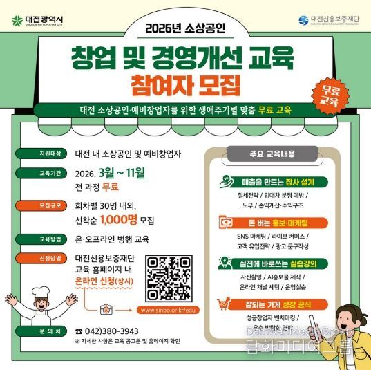시민행정신문 이세훈 기자 | 대전시는 예비창업자와 소상공인의 경영 역량 강화를 위해 ‘2026년 창업 및 경영개선 교육’참여자를 모집한다.