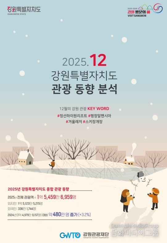 시민행정신문 강갑수 기자 | 강원관광재단은 빅데이터 기반의 강원관광 동향분석을 통해 강원특별자치도를 방문한 2025년 전체 관광객은 전년 대비 약 480만 명(3.2%) 증가한 약 1억 5,460만 명이라고 밝혔다.