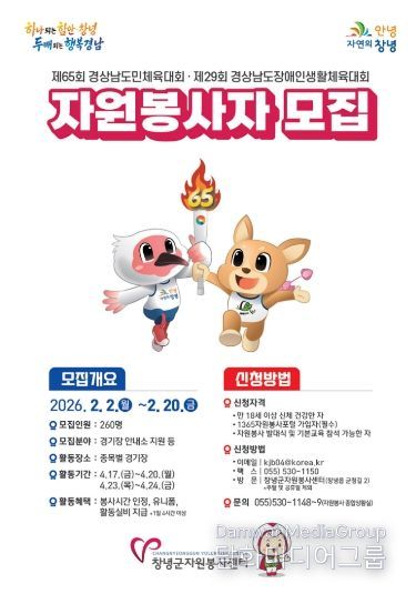 시민행정신문 강갑수 기자 | 창녕군은 오는 4월 17일부터 20일까지 열리는 제65회 경상남도민체육대회와 4월 23일, 24일 진행되는 제29회 경상남도장애인생활체육대회의 성공적인 개최를 위해 자원봉사자 260명을 모집한다.