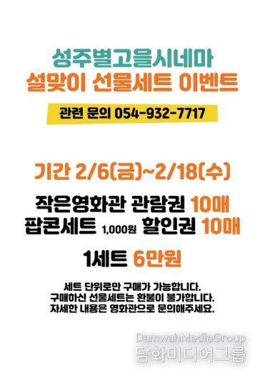 시민행정신문 기자 | 성주별고을시네마(창의문화센터 3층)는 민족 대명절 설을 맞아 2월 6일부터 2월 18일까지 ‘설맞이 선물세트 이벤트’를 진행한다.