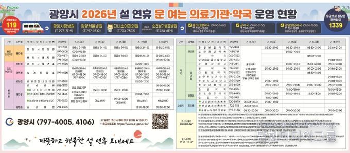 연휴 동안 지역 응급의료기관인 ▲광양사랑병원 ▲광양서울병원 등 2개소는 응급실을 24시간 비상체제로 운영하며, 관내 병·의원 105개소, 보건의료기관 6개소, 휴일지킴이 약국 46개소가 문을 열어 의료 서비스를 제공한다.