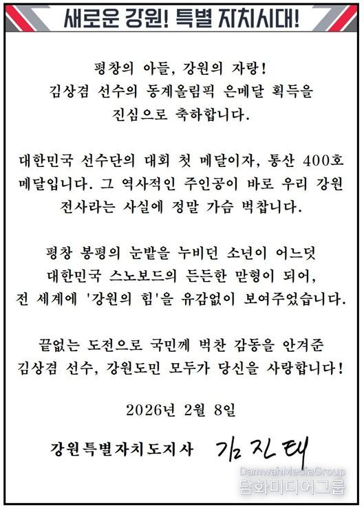 시민행정신문 장규호 기자 | 김진태 도지사는 8일 2026 밀라노-코르티나담페초 동계올림픽대회에서 강원특별자치도(하이원 스포츠단) 소속 김상겸 선수의 남자 스노보드 평행대회전 은메달 획득을 축하하며, 축전을 보냈다.