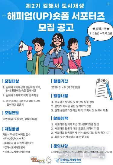 시민행정신문 강갑수 기자 | 김해시도시개발공사(이하 공사)는 오는 3월 8일까지 ‘제2기 김해시 도시재생 해피업(UP)숏폼 서포터즈’를 모집한다.
