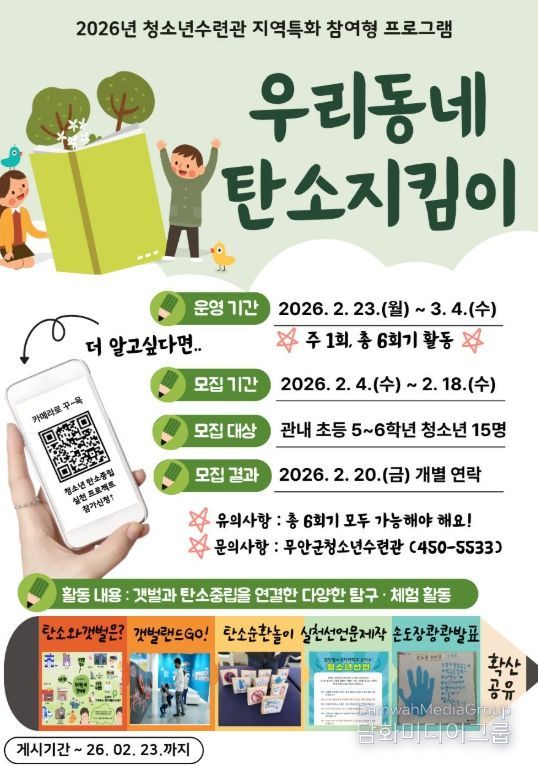 모집 대상은 무안군 관내 초등학교 5~6학년 청소년이며, 신청은 2월 18일까지 선착순으로 접수한다.