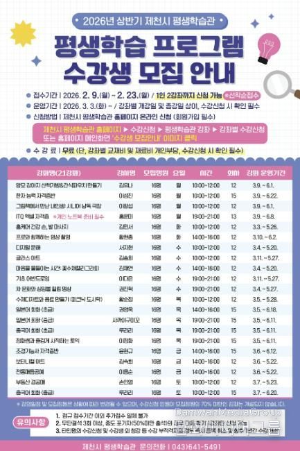 시민행정신문 강갑수 기자 | 제천시가 2월 23일까지 2026년 상반기 평생학습관 프로그램 수강생을 모집한다.
