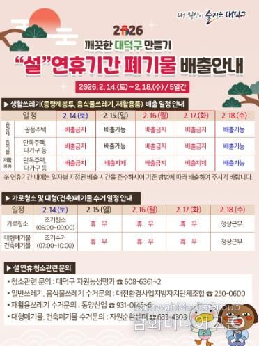 한편, 구는 설 연휴 생활 쓰레기 수거 일정을 대덕구 누리집, 카드뉴스, 네이버 블로그․밴드 등을 활용해 사전 홍보하며 각 가정에서 쓰레기 배출로 인한 불편이 발생하지 않도록 안내에 나서고 있다.
