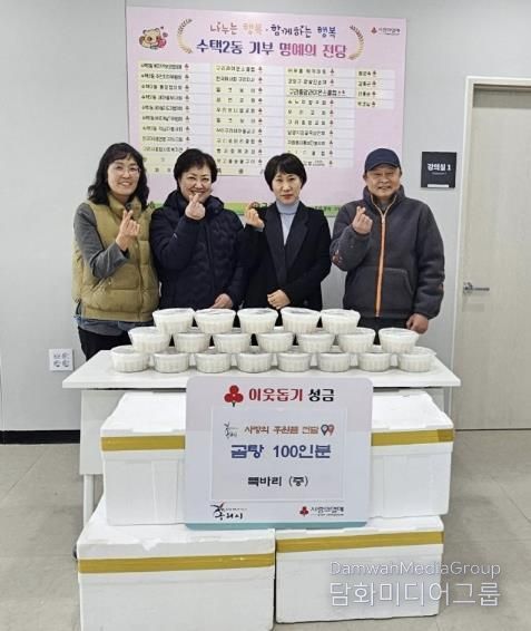 시민행정신문 강갑수 기자 | 구리시 수택2동 행정복지센터는 지난 2월 9일, 지역 음식점 뚝바리로부터 설 명절을 맞아 설렁탕 100인분을 후원받아 관내 저소득 취약계층에 전달했다고 밝혔다.
