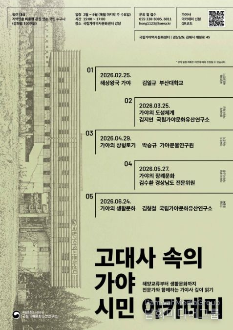 시민행정신문 이존영 기자 | 국가유산청 국립문화유산연구원 국립가야문화유산연구소는 2월부터 6월까지 매월 마지막 주 수요일, 국립가야역사문화센터 강당(경남 김해시)에서 시민들을 대상으로 '고대사 속의 가야' 시민 아카데미를 개최한다.
