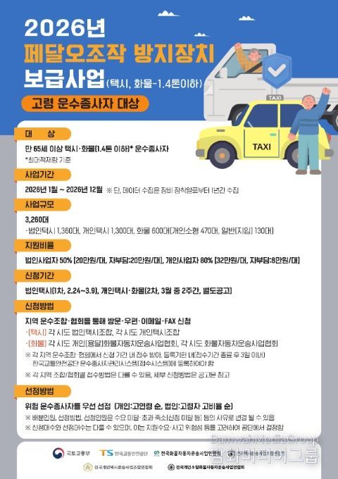 이번 사업은 만 65세 이상 택시 및 화물차량(최대적재량 1.4톤 이하) 운수종사자 대상으로 추진하며, 1차 공고는 법인택시를 대상으로 2월 24일부터 3월 9일까지 각 시도 법인택시조합을 통해 접수한다.