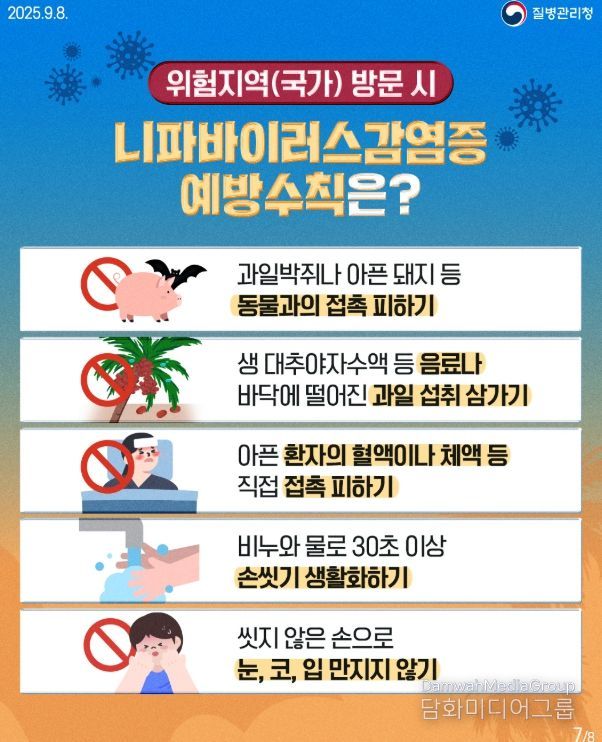 또한 인도·방글라데시 등 니파바이러스 발생 국가를 방문한 후 귀국 14일 이내 발열, 두통, 인후통 등 의심 증상이 있으면 즉시 질병관리청이나 관할 보건소로 신고해야 한다.