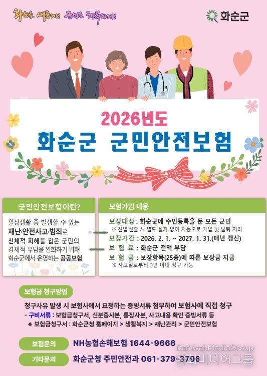 화순군은 군민안전보험 운영과 함께 보장 내용과 보험금 청구 절차에 대한 안내를 강화하고, 사고 발생 시 보험 혜택을 원활히 받을 수 있도록 지원할 계획이다.