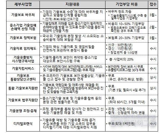 사업별 자세한 내용은 기술보호 통합 포털 기술보호울타리에서 확인할 수 있다.