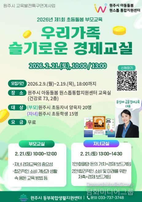 시민행정신문 강갑수 기자 | 원주시 아동돌봄 원스톱통합지원센터는 2월 21일 초등생 가족을 위한 무료 경제 교육인'우리 가족 슬기로운 경제 교실'을 운영한다.