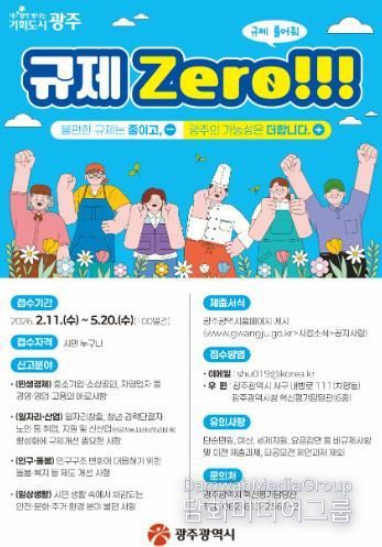 광주광역시는 ‘불합리한 규제 집중발굴, 규제 제로’를 목표로 11일부터 5월 20일까지 100일 동안 불합리한 규제 집중발굴 기간을 운영한다.