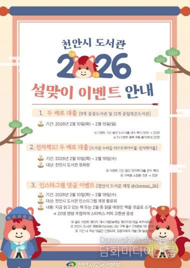 문현주 천안시도서관본부장은 “설 연휴 기간 도서관 휴관으로 인한 이용 불편을 최소화하고, 시민들이 책과 함께 의미있는 명절을 보낼 수 있도록 다양한 행사를 마련했다”며 “도서관에서는 연중 다양한 독서 프로그램이 운영되고 있는 만큼 많은 관심과 참여를 바란다”고 말했다.