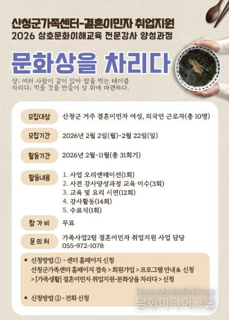 시민행정신문 강갑수 기자 | 산청군가족센터는 오는 22일까지 결혼이민자의 안정적인 사회 참여와 취업 역량 강화를 위해 '상호문화이해교육 강사양성과정'참여자를 모집한다고 10일 밝혔다.