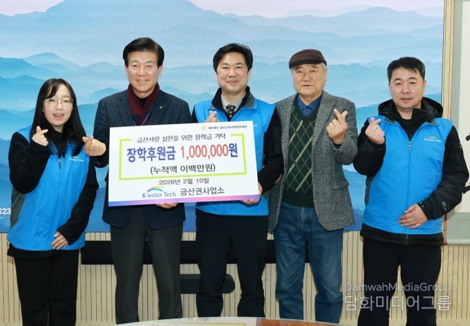 박범인 금산군수는 “지역 인재 양성을 위한 케이워터기술의 지속적인 관심과 나눔에 감사드린다”며 “기탁금은 금산교육사랑장학재단을 통해 학생들의 꿈과 미래를 키우는 소중한 밑거름이 될 것”이라고 전했다.