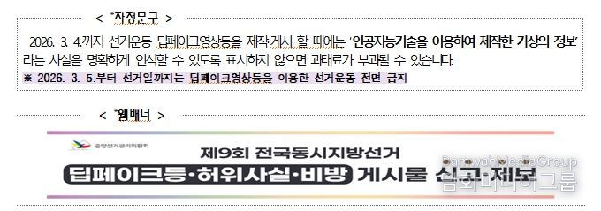 포털사 뉴스 댓글창, 인터넷 커뮤니티, AI사 홈페이지 등에'공직선거법'안내 자정문구를 표출하여 온라인 자율 규제 유도를 통해 위법행위를 사전에 예방하는 한편,주요 포털사와 인터넷 커뮤니티 홈페이지 등에 웹배너를 게시하여 위법게시물 신고·제보도 활성화한다.