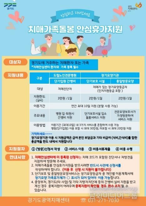 시민행정신문 기자 | 평택시 치매안심센터는 치매 가족의 돌봄 부담을 완화하고 정서적 재충전의 기회를 제공하기 위해 '경기도 치매가족돌봄 안심휴가 지원사업'을 운영한다고 밝혔다.