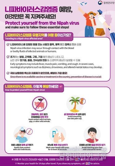 이재홍 대구광역시 보건복지국장은 “안전하고 즐거운 여행을 위해 여행 전 국가별 감염병 정보를 확인하고, 여행 중 예방수칙을 철저히 준수해 주시길 바란다”며 “귀국 후 발열 등 의심증상을 관찰하고 발생 시 보건소 또는 1339로 신고해 해외 방문 이력을 알리고, 신속한 진단 및 치료를 받아야 한다”고 강조했다.
