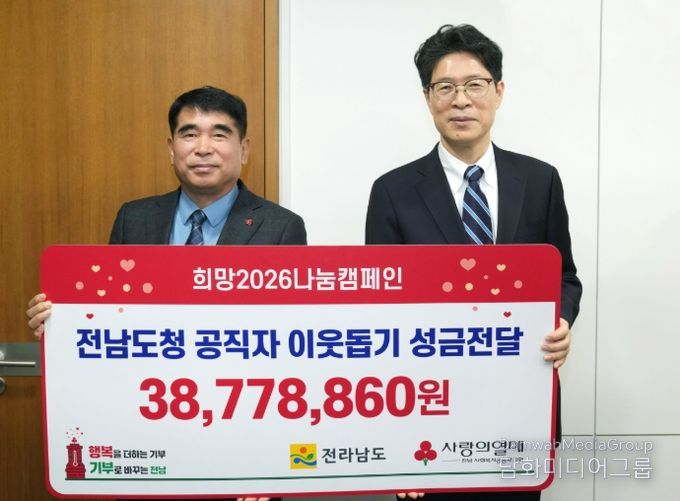 이번 성금은 2025년 12월 1일부터 2026년 1월 31일까지 두 달간 진행한 ‘희망2026나눔캠페인’ 일환으로, 전남도와 도의회, 소방본부 등 직원 2천242명이 자발적으로 동참해 마련했다.
