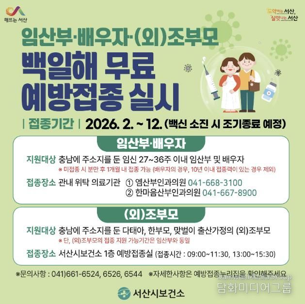 확대로 인해 서산시에 주소지를 둔 다태아·한부모·맞벌이 출산가정의 (외)조부모도 백일해 무료 예방접종을 받을 수 있게 됐다.