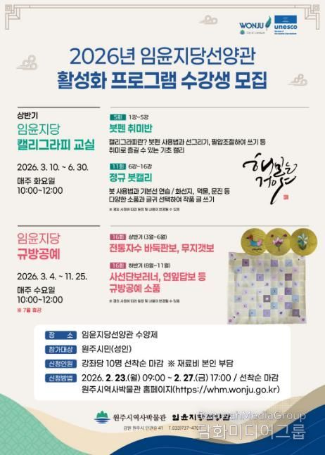 시민행정신문 강갑수 기자 | 원주시 임윤지당선양관은 오는 3월부터 11월까지 선양관 활성화 프로그램으로 ‘임윤지당 규방공예’와 ‘임윤지당 캘리그라피’ 강좌를 운영한다.
