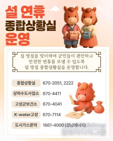 한편, 연휴 중 각종 불편사항 신고는 고성군청 당직실로 연락하면 된다.