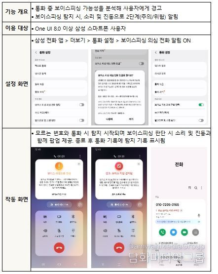 삼성전자는 갤럭시 스마트폰에 기본으로 탑재된 전화 앱에서 ‘보이스피싱 의심 전화 알림’ 기능을 제공하고 있다. 이 기능은 모르는 번호로 걸려온 전화의 통화 내용을 분석해 ‘의심(보이스피싱 의심)’, ‘경고(보이스피싱 감지)’ 등 2단계에 걸쳐 이용자에게 알림을 제공한다.