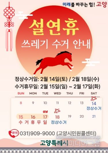시민행정신문 강갑수 기자 | 고양특례시는 설 연휴를 앞두고 시민들이 깨끗하고 쾌적한 환경에서 명절을 보낼 수 있도록 ‘설 연휴 생활쓰레기 관리대책’을 마련하고 비상 대응체계를 운영한다.
