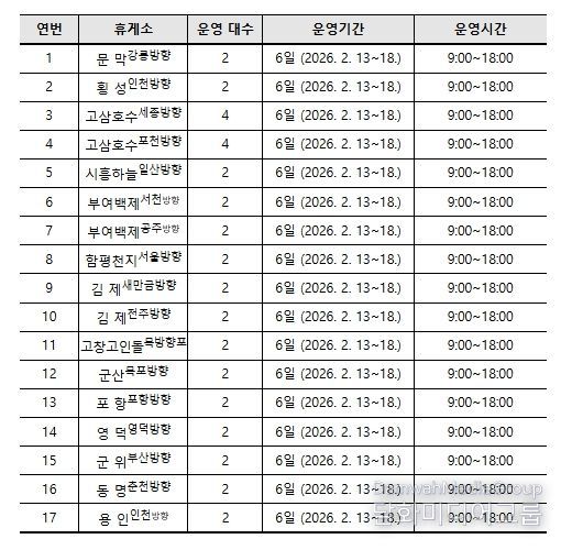 아울러 연휴 기간 중 이용자 불편을 최소화하기 위해 전화상담 창구(☏ 1661-9408) 등 비상연락체계가 운영된다.