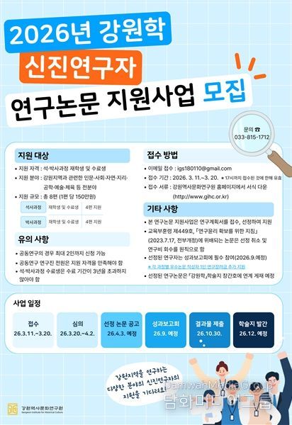 시민행정신문 강갑수 기자 | 강원역사문화연구원은 강원학 연구 활성화를 도모하고 강원학 전문 인재 양성을 위해 신진연구자를 대상으로 한 ‘강원학 연구논문 지원사업’을 진행한다.