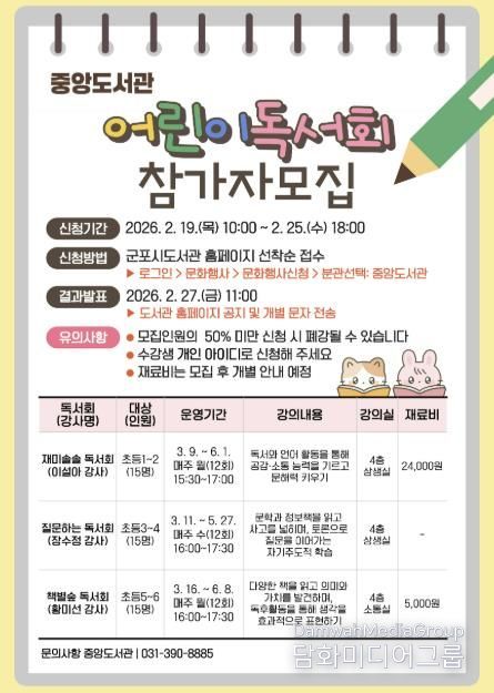 시민행정신문 강갑수 기자 | 군포시 중앙도서관은 독서를 통해 생각하고 함께 소통하며 올바른 독서습관 형성과 문해력을 키우는 아동 및 청소년 대상 독서회를 오는 3월 9일부터 6월 13일까지 운영한다.