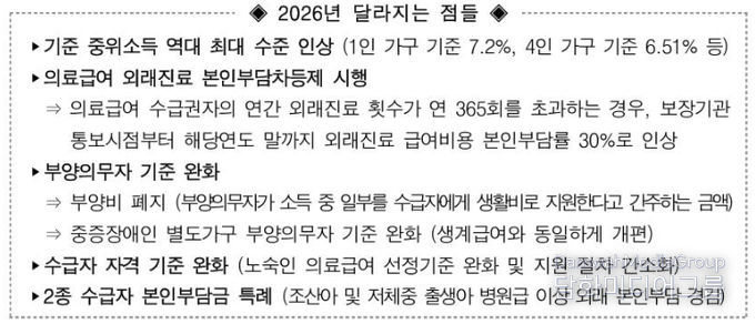 특히 2026년에는 *기준 중위소득이 역대 최대 수준으로 인상됨에 따라 의료급여 수급 대상이 확대된다.