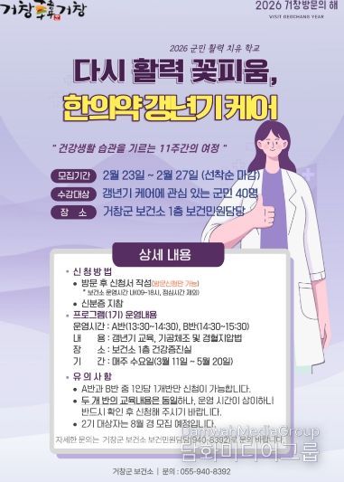 시민행정신문 기자 | 거창군 보건소는 중·장년층의 신체적·정신적 변화로 인한 갱년기 증상을 예방하고 스스로 건강을 관리할 수 있는 역량을 강화하기 위해 ‘2026년 한의약 갱년기 건강관리 프로그램’ 참여자를 모집한다.