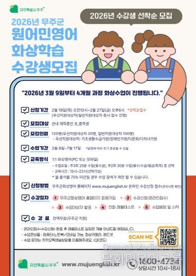 시민행정신문 강갑수 기자 | 무주군이 지역 내 초·중학생을 대상으로 ‘원어민 화상영어 지원사업’을 추진한다고 밝혔다. 이 사업은 지역 간 교육격차를 해소하고 글로벌 인재 양성을 위해 진행하는 것으로, ‘원어민 강사와의 1:1 화상영어 수업’ 수강료를 전액 지원한다.