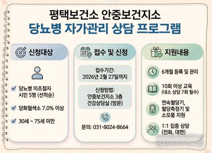 모집 대상은 30세 이상 75세 미만의 당뇨병 미조절자(당화혈색소 7.0% 이상)이며, 선정 기준에 해당하지 않더라도 집중 관리가 필요하다고 판단되면 대상자로 포함될 수 있다. 모집 인원은 총 5명으로, 소규모 맞춤형으로 운영된다. 참여를 희망하는 시민은 2월 27일까지 안중보건지소 만성질환팀으로 방문해 신청하면 된다.