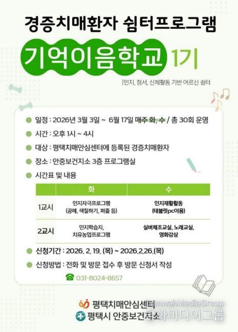 시민행정신문 기자 | 평택시 안중보건지소는 경증 치매 환자의 인지기능 유지와 일상생활 지원을 위해 오는 3월 3일부터 6월 17일까지 경증 치매 환자 쉼터 프로그램 ‘기억이음학교 1기’를 운영한다.