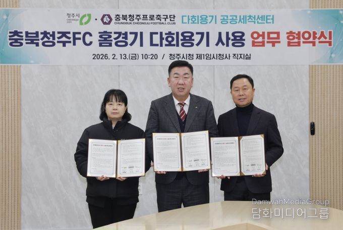 시민행정신문 김학영 기자 | 청주시는 13일 충북청주 프로축구단(충북청주FC), 다회용기 공공세척센터와 함께 충북FC 홈경기 다회용기 사용 확대를 위한 업무협약을 체결했다.