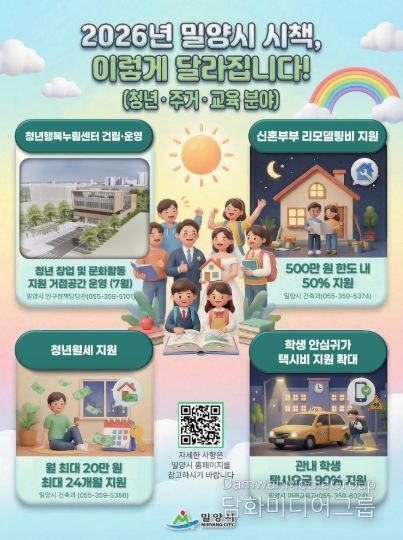 시민행정신문 기자 | 밀양시는 청년들이 지역에 안정적으로 뿌리 내리고 미래를 설계할 수 있도록 주거와 교육, 문화가 어우러진 ‘청년 친화 도시’ 조성에 행정력을 집중한다. 2026년 청년 정책의 핵심은 청년들의 거점 공간 마련과 안정적인 주거 사다리를 구축하는 것이다.