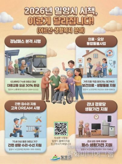 시 관계자는 “2026년 밀양의 노인 복지는 어르신들이 집 안팎 어디서나 소외되지 않고 안전하게 생활하시는 데 방점을 두었다”며 “어르신들의 활력 있는 노후가 곧 지역사회의 건강함으로 이어질 수 있도록 정책 추진에 만전을 기하겠다”고 말했다.