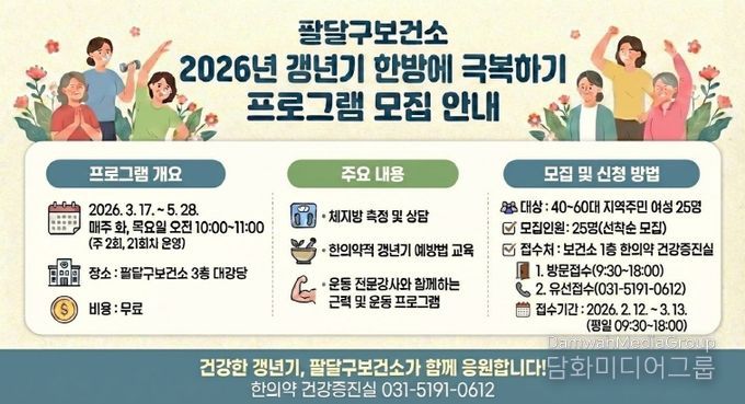 시민행정신문 기자 | 수원시 팔달구보건소가 ‘2026년 갱년기 한방에 극복하기’ 프로그램에 참여할 40~60대 지역 여성을 3월 13일까지 모집한다.
