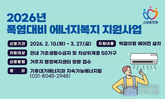 시민행정신문 강갑수 기자 | 안양시는 다가오는 여름철 폭염에 대비해 저소득 취약계층을 대상으로 벽걸이형 에어컨을 설치해 주는 ‘2026년 폭염 대비 에너지복지 지원사업’을 추진 중이라고 18일 밝혔다.