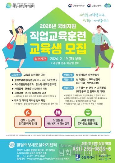 시민행정신문 강갑수 기자 | 수원시 팔달여성새로일하기센터가 ‘2026년 직업교육훈련’ 교육생 60명을 2월 19일부터 모집한다.