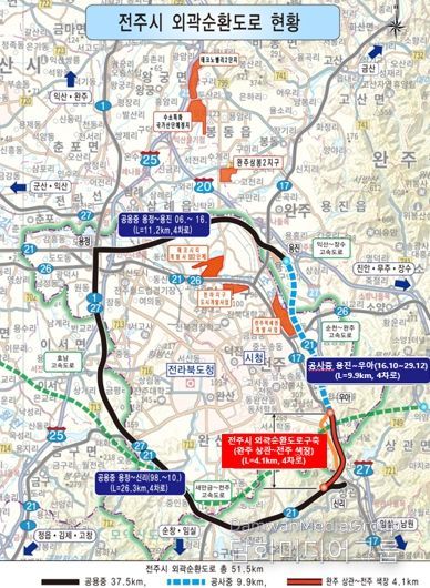 현재까지 완주 신리~전주 용정~용진을 잇는 37.5km 구간은 사업비 7,149억원을 들여 개통 운영 중이며, 전주 용진~우아(색장동) 9.9km 구간은 사업비 3964억 원을 들여 2029년 준공을 목표로 공사가 진행 중이다. 하지만 완주 상관~전주 색장 구간은 아직 착수 단계에 이르지 못해 외곽순환망의 기능이 반쪽에 그치고 있다는 지적이 이어져 왔다.