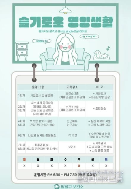 팔달구보건소 관계자는 “다 회차 프로그램으로 참여자들의 자기 주도적 건강 식생활 실천 능력을 높이고, 올바른 식생활 인식을 확산하겠다”며 “1인 가구의 영양 불균형 완화에 도움이 되길 바란다”고 말했다.