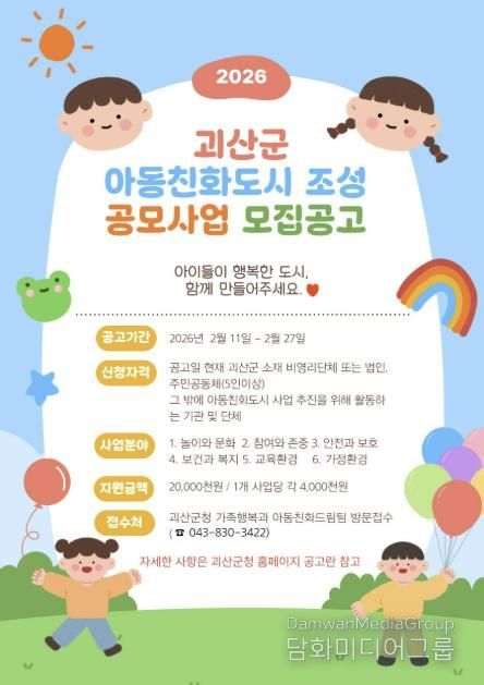 시민행정신문 강갑수 기자 | 충북 괴산군은 아동친화도시 공모사업에 참여할 비영리법인(단체)을 오는 27일까지 공개 모집한다고 밝혔다.