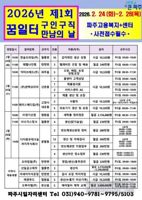 시민행정신문 강갑수 기자 | 파주시는 지역 내 구직자와 구인기업 간의 실질적인 취업·채용 기회를 제공하고 지역 고용 활성화를 도모하기 위해 2026년 제1회 ‘구인·구직 만남의 날’을 오는 2월 24일부터 26일까지 3일간 파주고용복지플러스센터(금촌동 엠에이치(MH)타워 8층)에서 개최한다.