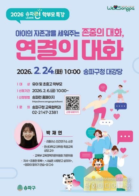 올해 첫 강연은 2월 24일 오전 10시 송파구청 대강당에서 열린다. 구는 부모·자녀 소통 전문가인 박재연(리플러스 인간연구소) 소장을 초청해 ‘아이의 자존감을 세워주는 존중의 대화, 〈연결의 대화〉’를 주제로 강연을 진행한다.